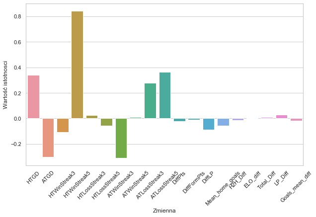 sns.barplot(x="Zmienna", y="Wartość istotnosci", data=lr_c , ax=axes[0])