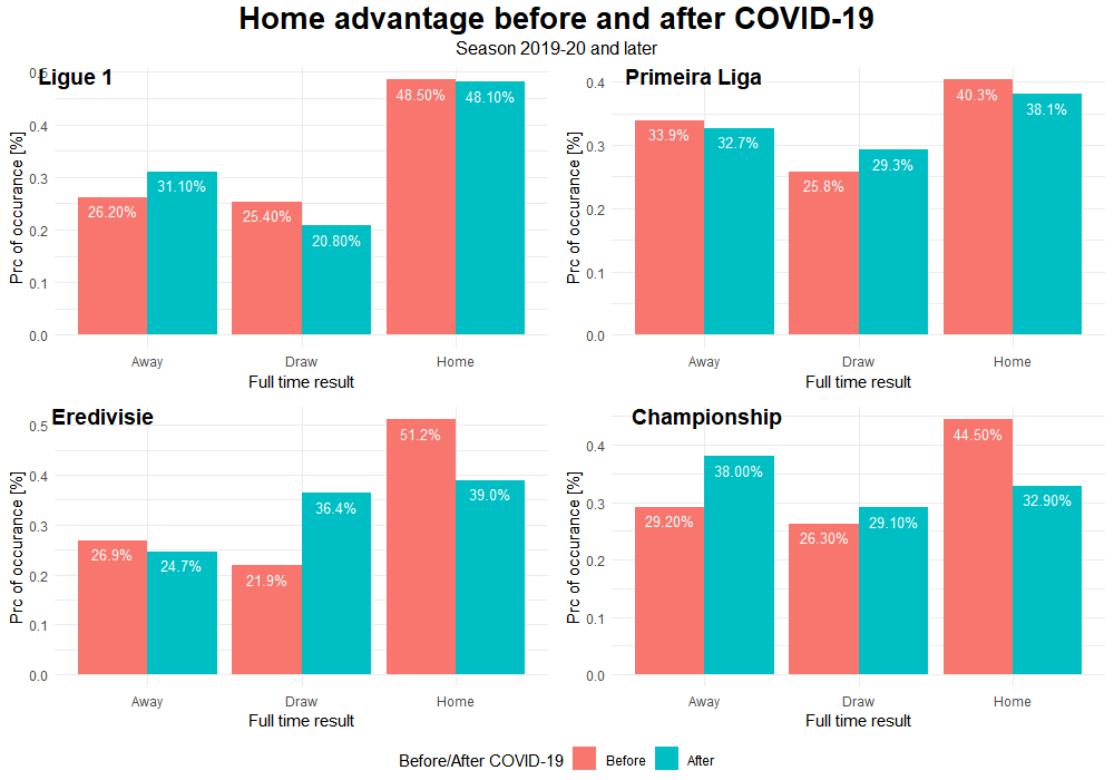We wszystkich przedstawionych wyżej ligach mogliśmy zaobserwować spadek procentu wygranych meczów u siebie. Można było się tego spodziewać, biorąc pod uwagę utratę tzw. „12. zawodnika” podczas meczu na własnym boisku.