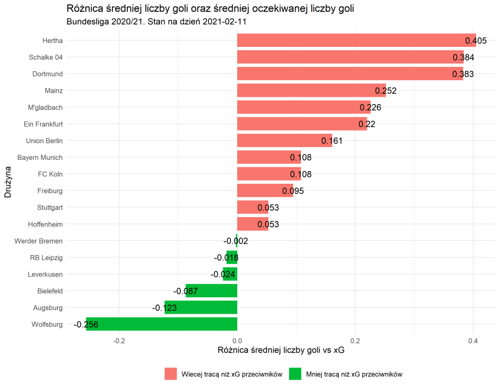 W lidze niemieckiej liderem w rankingu średniej liczby xG oraz goli na mecz jest Bayern. Drużyna ta może pochwalić się wysoką skutecznością i ponadprzeciętnym wykorzystywaniem sytuacji bramkowych. Różnica ta jest niebywała gdyż Bayern zdobywa średnio 0.708 więcej gola na mecz niż jego średni xG. Z drugiej zaś strony Shalke traci zdecydowanie najwięcej goli, również więcej niżeli wynikałoby to z xG przeciwnika. Obok Shalke, drużyny takie jak Hertha Berlin oraz Borussia Dortmund liderują w statystyce różnicy traconych bramek do xG przeciwnika. Tracą znacznie więcej niż wynikałoby to z łatwości akcji przeciwnika. Po drugiej stronie mamy Wolfsburg, który traci zdecydowanie mniej bramek niż przeciwnik sobie wypracował z akcji.