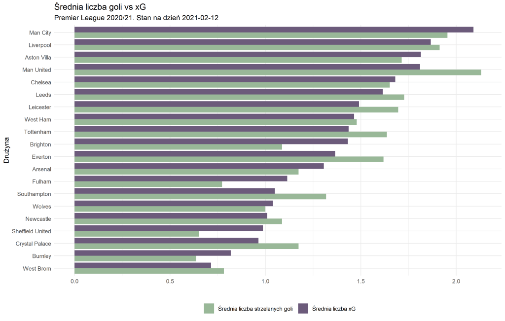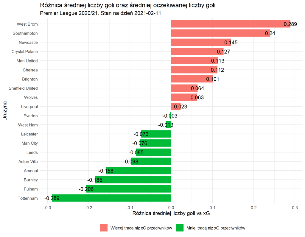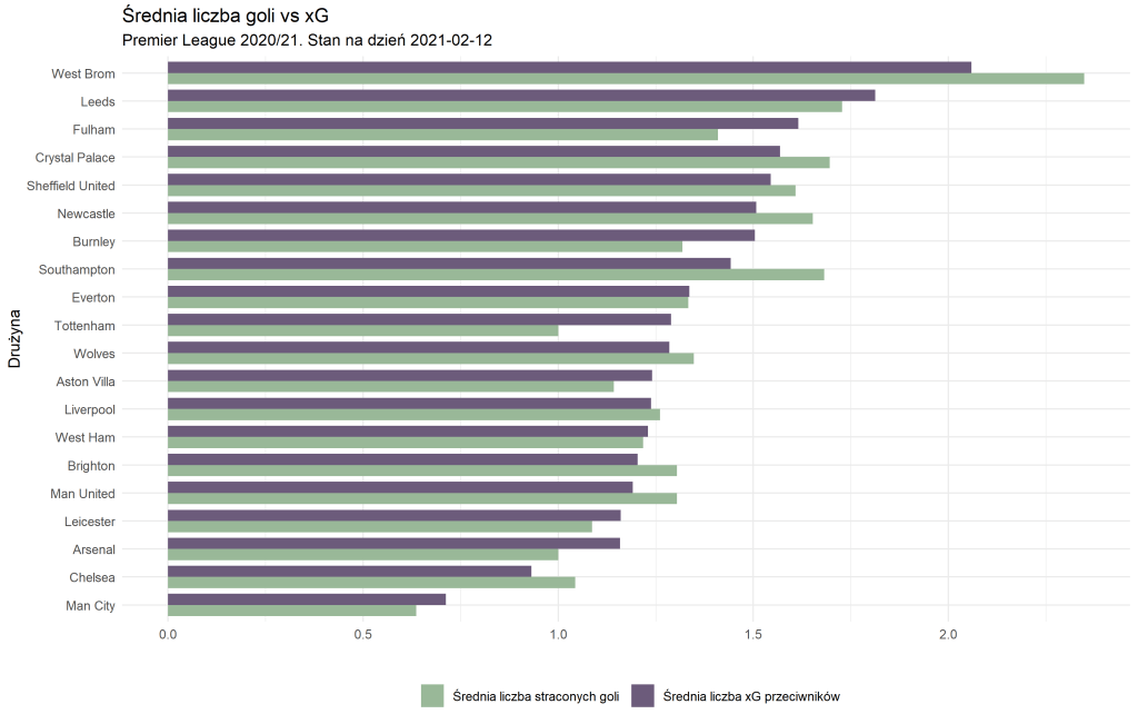 Najwięcej bramkę w lidze na tę chwilę traci West Bromwich Albion, co ciekawe ich średnia wartość oczekiwanej liczby traconych bramek jest znacznie niższa. Tracą zatem mniej aniżeli dopuszczają do strzałów. Przeciwnicy wykorzystują zatem ponad przeciętną liczbę sytuacji bramkowych w meczach z WBA. Najniższym wskaźnikiem średniej liczby oczekiwanej liczby goli przez przeciwników może pochwalić się Man City, który zarówno najmniej traci bramek w lidze ale również najlepiej obniża xG przeciwników.