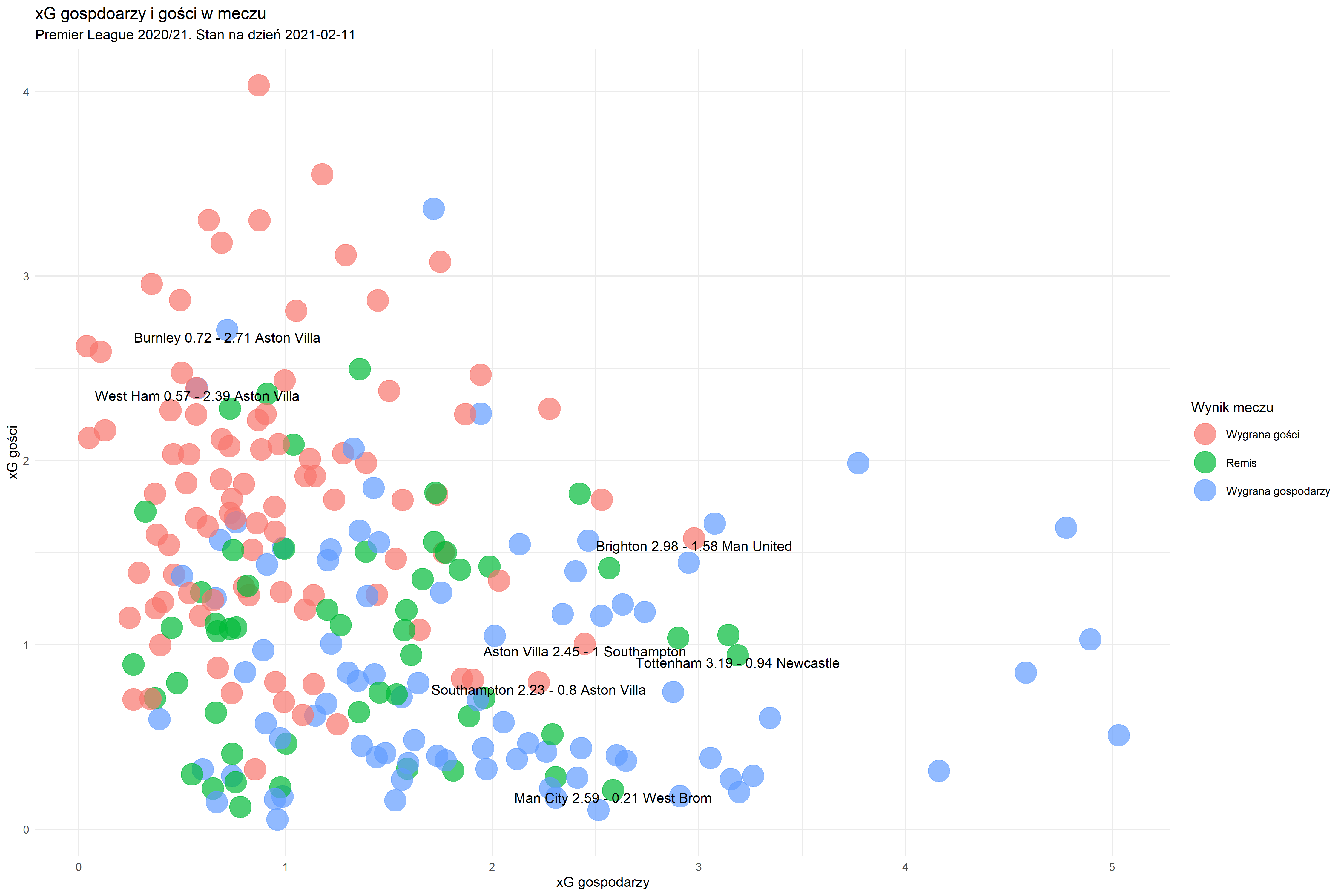 Przedstawiłem na wykresie wszystkie mecze w aktualnym sezonie Premier League, pogrupowane po wyniku spotkania. Na osi x – parametr xG gospodarzy w meczu, na osi y – parametr xG drużyny przyjezdnych. Zaznaczyłem na nich kilka spotkań, które mogą wydawać się anomaliami w analizie spotkań piłkarskich. Etykietowane są one nazwami drużyn oraz odpowiednimi parametrami xG dla ich w tym meczu. Krótka opis niektórych z nich:
