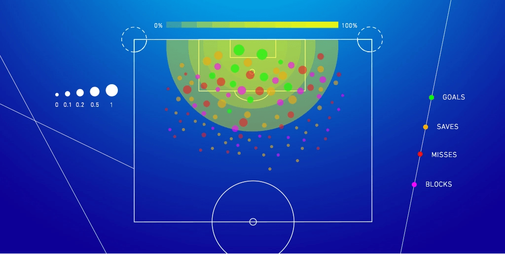 Jeśli xG dla danego strzału wynosi 0.5, oznacza to, że gdyby zostało oddanych 10 takich samych identycznych strzałów, oczekiwano by, że 5 z nich zakończy się golem. Ładnie przedstawione zostało to tu, skąd zaczerpnąłem poniższy obrazek.