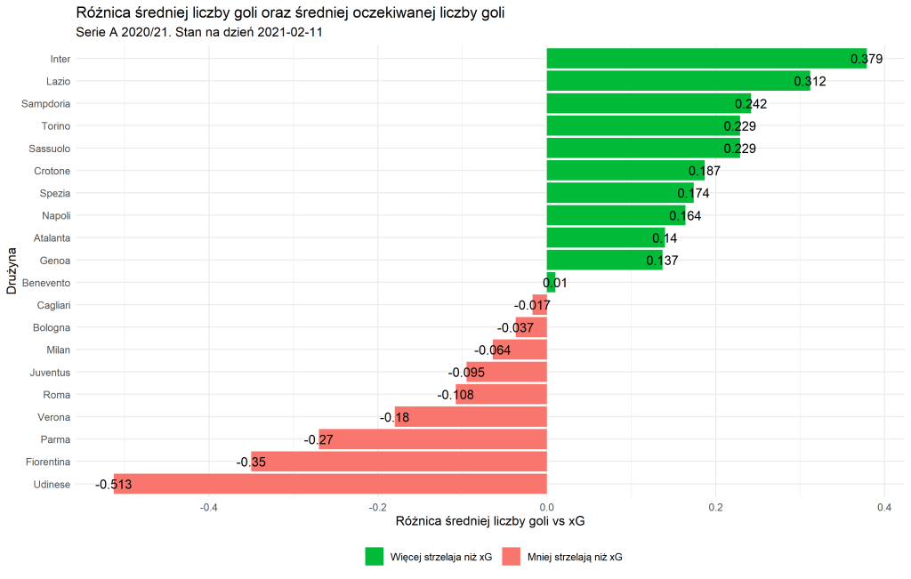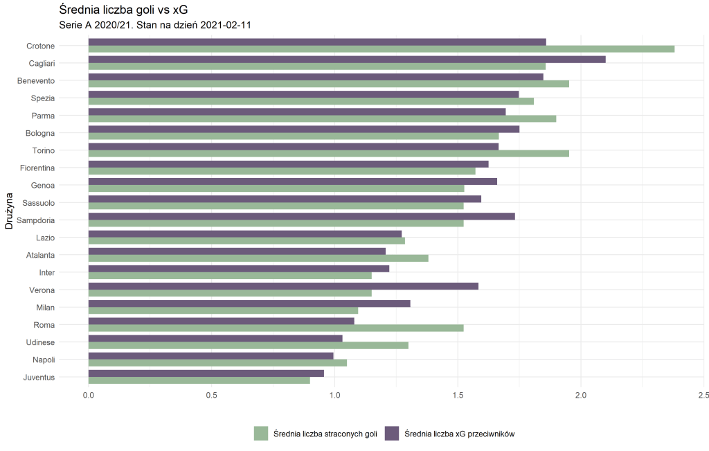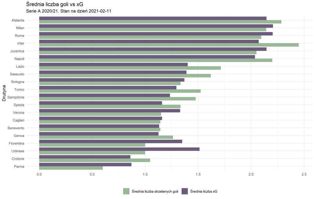 W lidze włoskiej na pierwszy plan wysuwa się dosyć ścisła czołówka w postaci 6 drużyn: Atalanta Milan, Roma, Inter, Juventus oraz Napoli. Najlepszą średnią jeśli chodzi o dogodność sytuacji bramkowych może pochwalić się Milan, tuż za nim Roma. Inter natomiast ma wysoką skuteczność kończenia akcji golem. Z drugiej strony natomiast, Udinese strzela średnio pół gola na mecz mniej aniżeli jego średnie xG w meczu. Jeśli chodzi o gole stracone to zdecydowanie należy wskazać Crotone, które traci znacznie więcej goli aniżeli średnie xG przeciwników na mecz. Roma również traci dosyć dużo bramek w stosunku do tego ile sytuacji stwarzają sobie przeciwnicy.