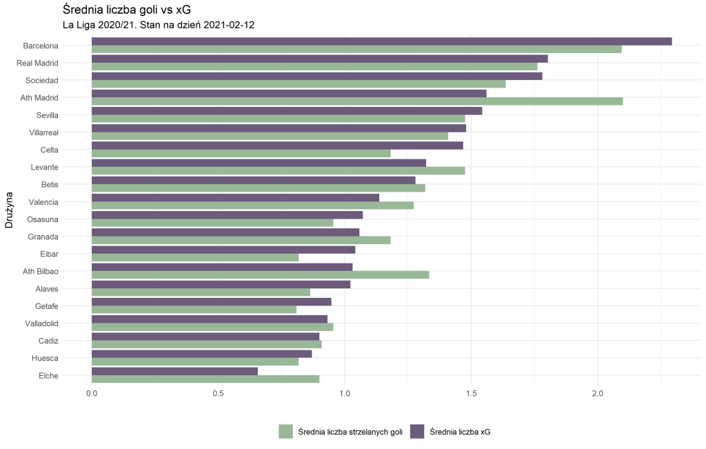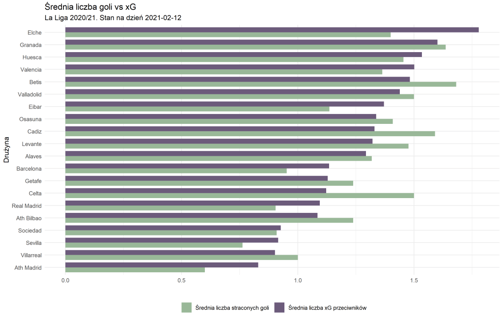 W lidze hiszpańskiej na pierwszy plan wysuwa się Barcelona z największą wartością średniej oczekiwanej liczby goli. Mimo, że przewaga nad następnymi jest znaczna, w średniej liczbie zdobytych goli przegrywa z Athletico Madryt. Real natomiast charakteryzuje się bardzo małą różnicą w obu parametrach. Aktualny lider La Liga może pochwalić się niebywałą skutecznością swoich strzałów i akcji. Może to efekt Suareza? Celta ma najbardziej niekorzystną różnicę parametrów w obronie, natomiast Elche traci zdecydowanie mniej goli niż mogłoby to wynikać ze wskaźnika xG dla przeciwników.