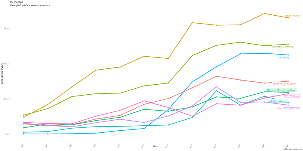 Suma wartości zawodników w klubie – Bundesliga – na przestrzeni ostatnich sezonów