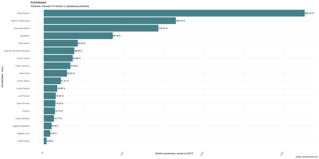 W Ekstraklasie podobnie jak w Bundeslidze to ostatni sezon okazał się rekordowy pod względem ogólnej wartości zawodników w lidze. W sezonie 2020/21 wartość ta wyniosła 300 mln €. Najwyżej wycenianymi klubami jest Lech Poznań, Legia Warszawa oraz ostatnimi latami Pogoń Szczecin. Co ciekawe trzecim najwyżej wycenianym w poprzednim sezonie w lidze był Raków Częstochowa. Zespół ten plasuje się również w czołówce jeśli chodzi o średni procentowy wzrost ostatnimi laty. Najlepszym jednak klubem pod tym względem jest Warta Poznań, która zalicza średnio pond 320% wzrost wartości swojej drużyny w ostatnich 10 sezonach. Niebywałe. Najgorzej pod tym względem wypada Wisła Kraków oraz Zagłębie Lubin.
