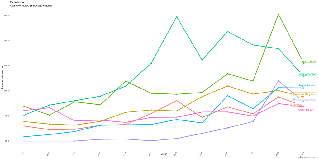 Suma wartości zawodników w klubie – Ekstraklasa- na przestrzeni ostatnich sezonów