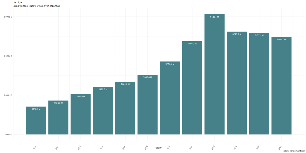 Suma wartości zawodników w klubie – La Liga – na przestrzeni ostatnich sezonów