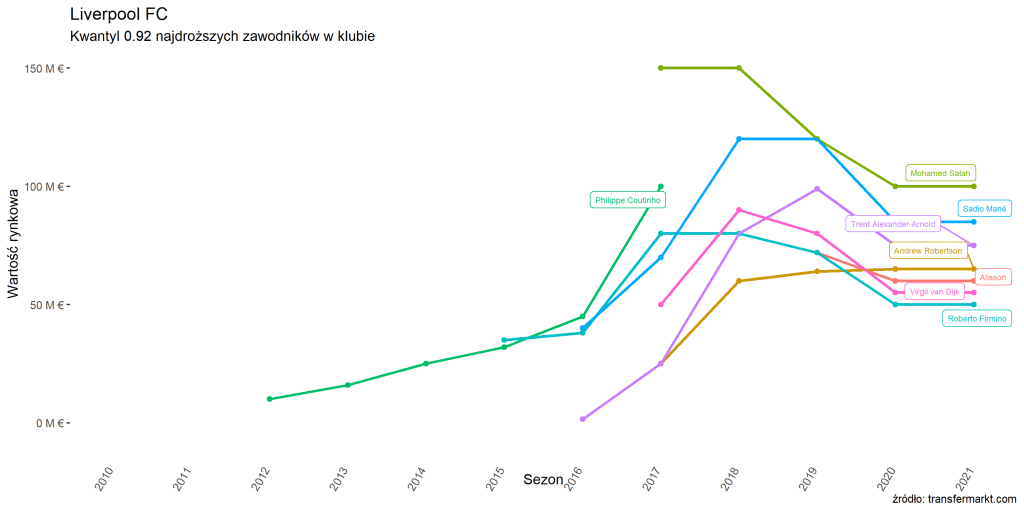 - Trio Salah, Mane oraz Firmino zaliczyło dosyć spory spadek wartości ostatnimi laty, co przekłada się na cały Liverpool pod względem wartości rynkowej. Pierwszy z nich ma najbardziej stromą linię spadku. Z wybranych zawodników obecnie grających w drużynie jedynie Robertson może pochwalić się wzrostem lub utrzymaniem się swojej wartości odkąd przeszedł na Anfield.