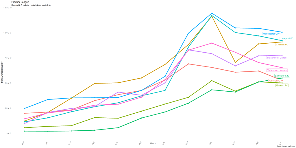 Suma wartości zawodników w klubie – Premier League – na przestrzeni ostatnich sezonów
