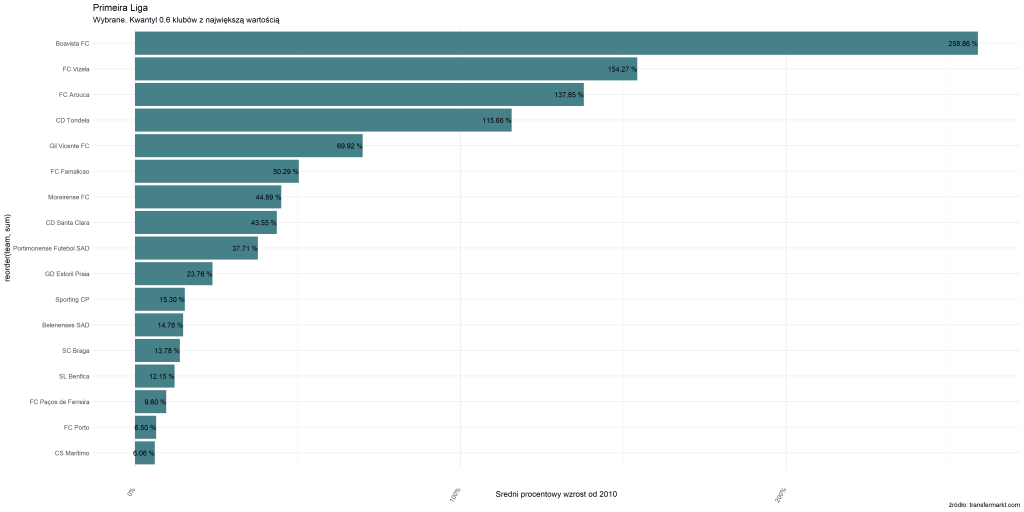 Średni procentowy wzrost wartości piłkarzy w kubie w ciągu ostatnich 10 sezonów – Primeira Liga