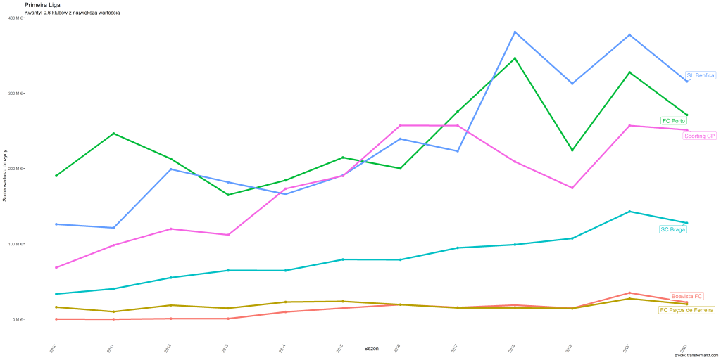 Suma wartości zawodników w klubie – Primeira Liga – na przestrzeni ostatnich sezonów
