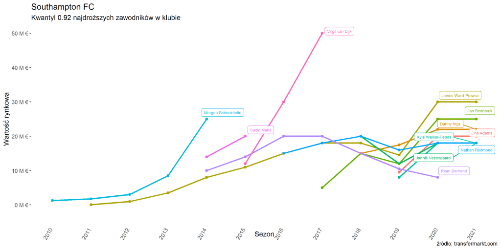Wartości zawodników na przestrzeni ostatnich sezonów – Southampton
